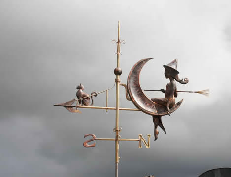 Weathervane with Golden Ball, Also featured, five NEW designs: "LEVEL" Weathervane, Witch on Moon Weathervane and the Fox and Crow, Kangaroo, and Bear and Goose.