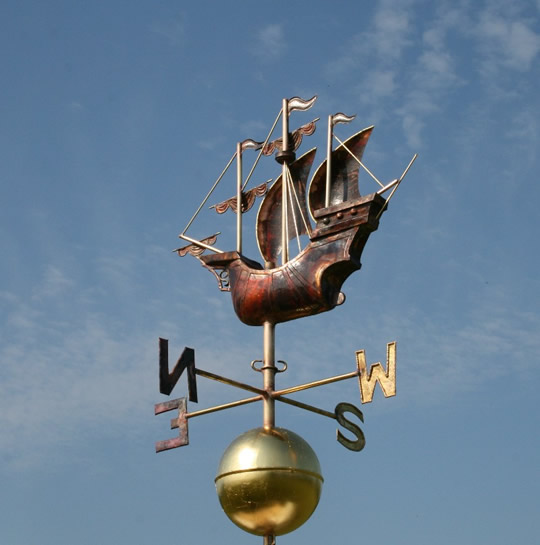 above is a custom repousse copper weathervane of a stylized galleon.